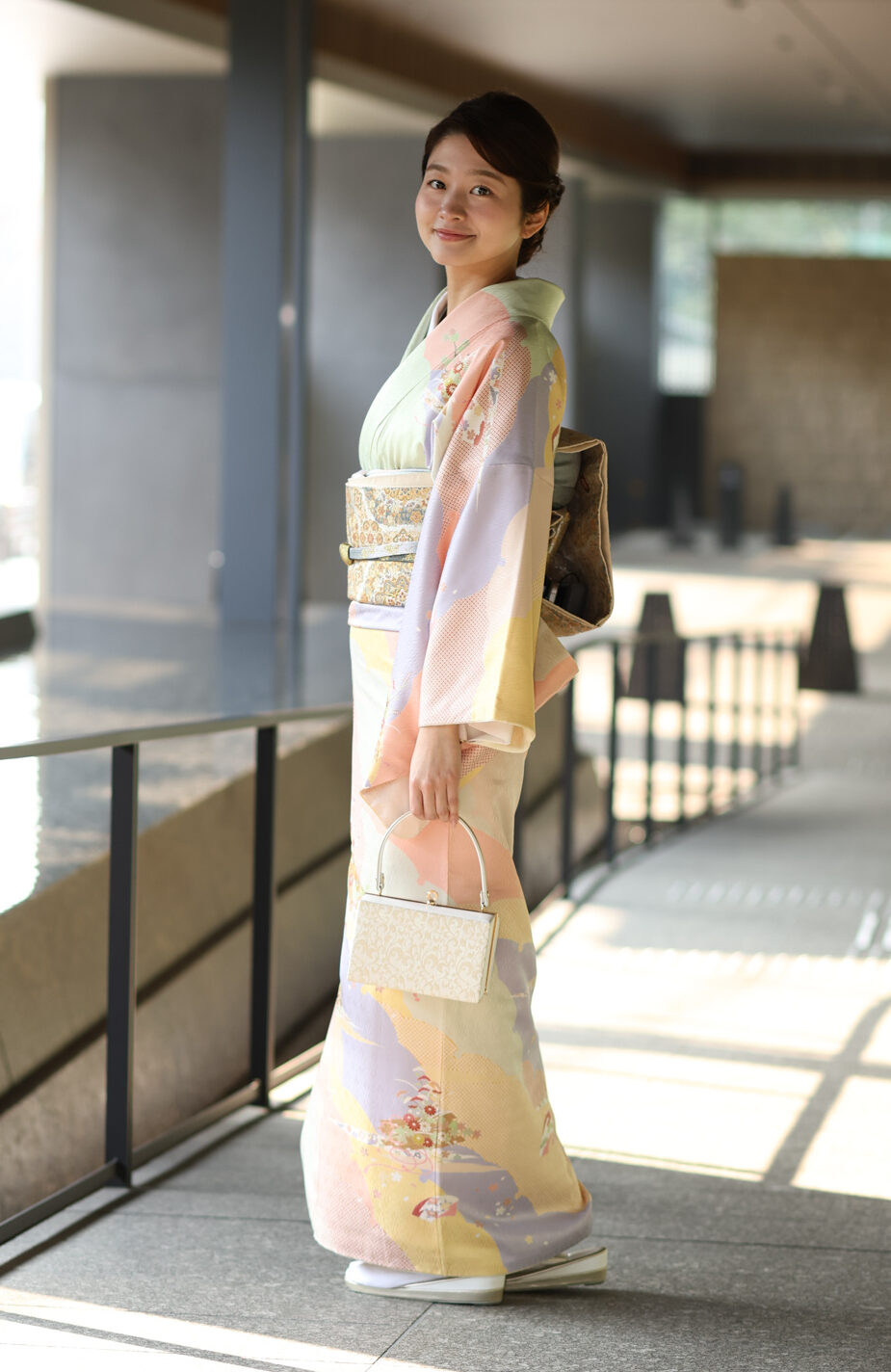 可愛らしさと大人の落ち着きを兼ね備えた装いがおすすめです。薄い藤色、ミントグリーン、落ち着いたサーモンピンクなどが人気です。柄の分量は多すぎず少なすぎず、上品な古典柄を選ぶと、式典らしい洗練された雰囲気が漂います。