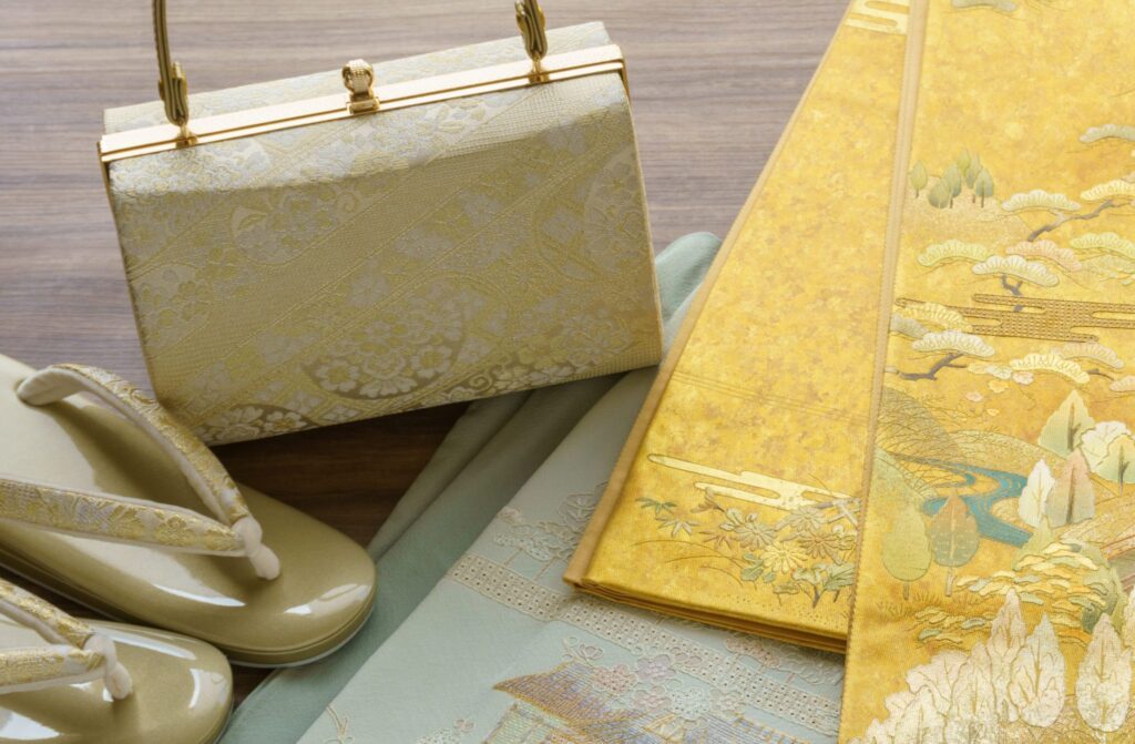 草履の台か鼻緒に金銀が用いられているような豪華な草履を合わせるのが望ましいです。バッグ同様、草履にも佐賀錦などの裂地が用いられているものが正式なものとされてきましたが、近年は皮革にパール加工や金粉を施したり、鼻緒に格調高い裂地を使ったりしたものも増えてきました。
