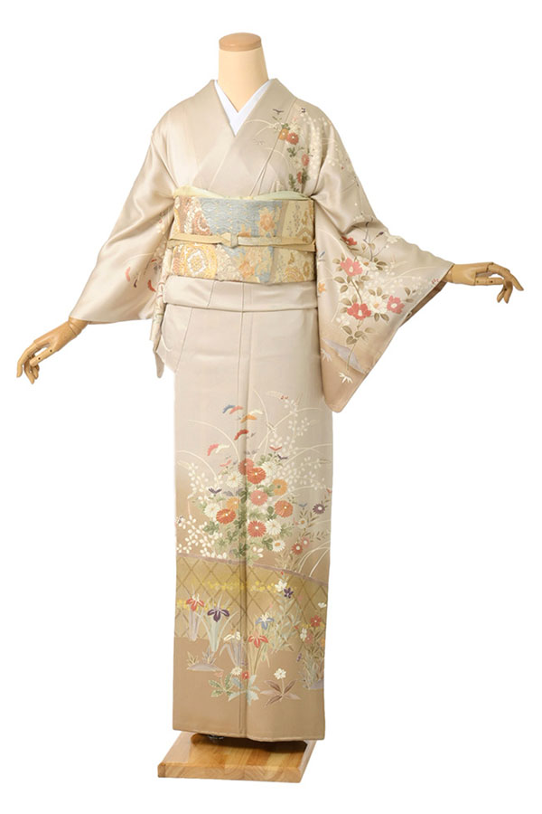 落ち着いたベージュや焦茶色、鶯色に染め分けた絹地に、牡丹や菊、藤などの花筏や鬘帯の文様を描いた訪問着でございます。