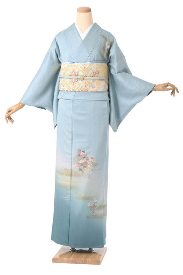 薄い藍の濃淡で染められた絹地に、アクセントに金駒刺繍の施された華文が配された訪問着でございます。入卒式、結婚式、お宮参りなどを含めた式典で着用できる略礼装のセットです。