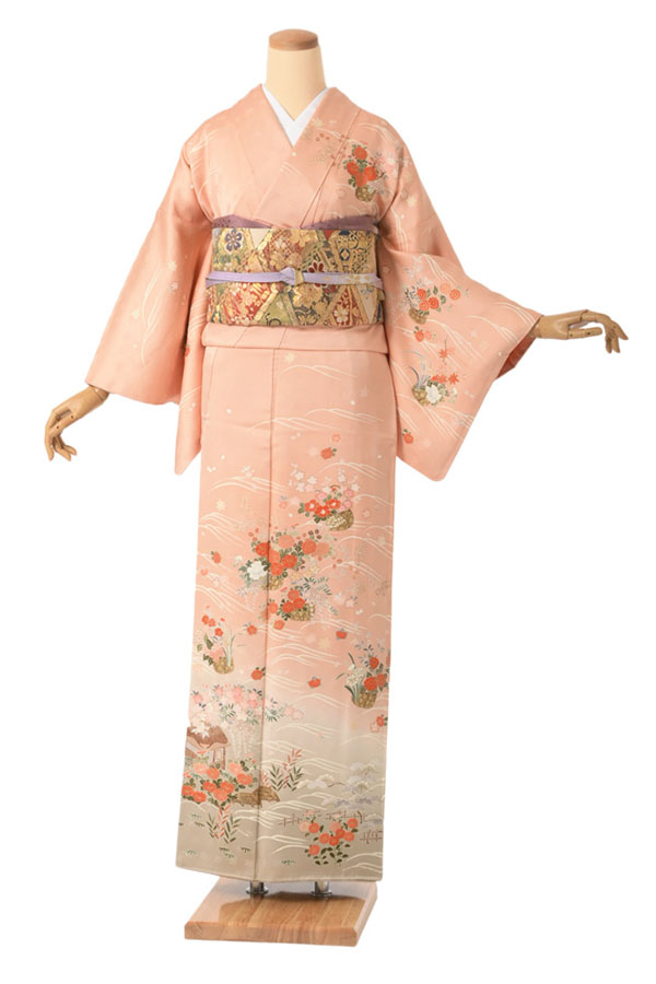 薄ピンクに染めた絹地に、金彩をふんだんに用いて菊や萩を描いた訪問着でございます。