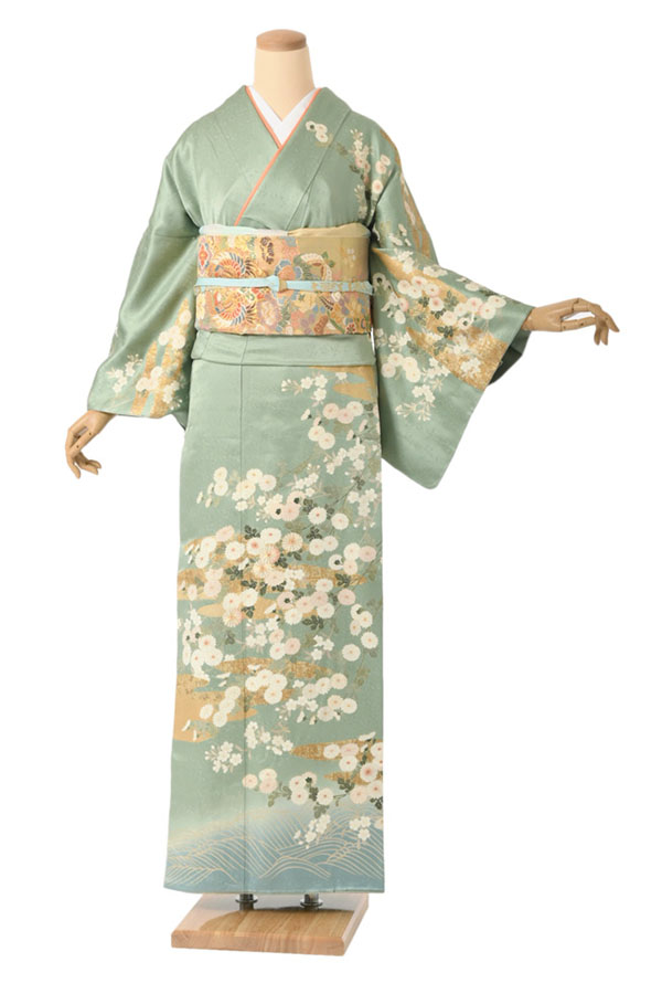 紗綾形に花の紋意匠が浮かぶ絹地を青竹色に染め上げて藍色の暈し染めを施しております。その地には桜や菊などの四季を感じされる花々に波のお柄が描き出されております。