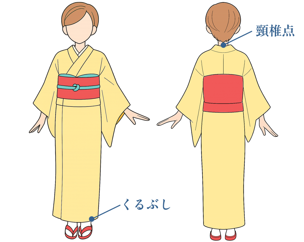 着丈は着物を着た時の丈の長さなので、首の後ろぐりぐり(頸椎点)からくるぶしあたりまでを測ることで長さを把握することができます。