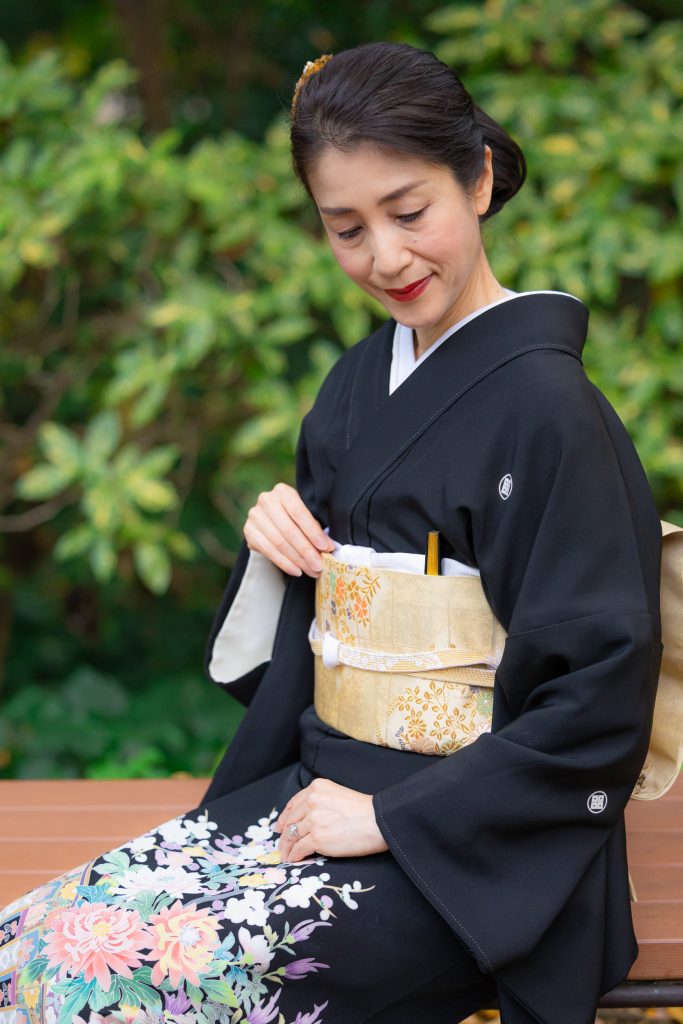 末広は祝儀扇ということで、礼装する際には礼装用小物の一つとして身に着けるのが良いとされています。特に、ミセスの第一礼装である黒留袖を着用する際には必ず末広を差すのが決まりとなっています。同様に、五つ紋付きの色留袖にも末広は必須です。